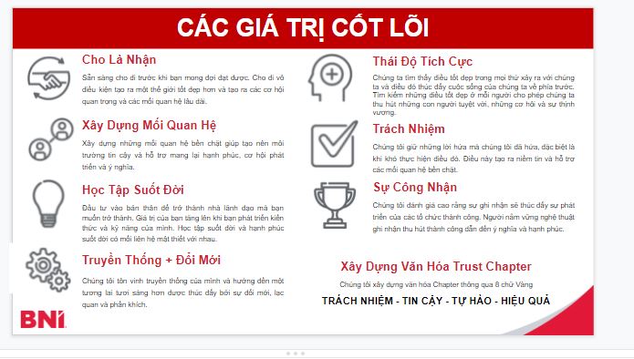 Cho là nhận, một câu nói rất ngắn gọn mà đầy ý nghĩa, BNI lấy triết lý “hãy cho đi trước” cho đi thật nhiều, và ở một thời điểm nào đó, ở một nơi nào đó không thể biết được bạn sẽ nhận lại được những kết quả xứng đáng một cách rất tự nhiên và đầy giá trị.