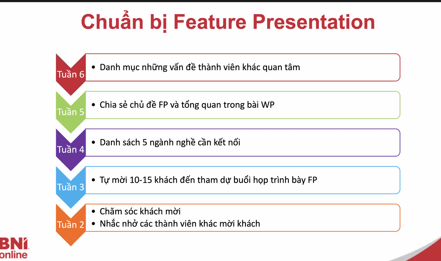 Phải gặp gỡ hàng tuần với các chủ doanh nghiệp, truyền thông sản phẩm dịch vụ của mình, phải thực hiện gặp ít nhất một thành viên mỗi tuần, trước khi gặp phải gửi cho đối tác mọi thông tin, định hướng kinh doanh, khách hàng mục tiêu… để cuộc gặp diễn ra ngắn gọn, hiệu quả. Bạn phải tham gia điều hành đội ngũ khi tập thể nhóm tin tưởng, bầu lên.