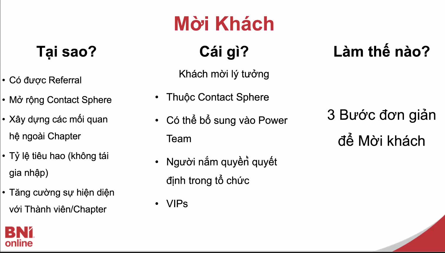 Tham gia vào BNI bạn sẽ được huấn luyện phương pháp và sử dụng hệ thống toàn cầu nhằm tạo ra nhiều cơ hội kinh doanh hơn để tăng doanh số và lợi nhuận. Những yếu tố này là động lực cho những người sáng lập BNI Việt Nam cũng như thành viên BNI Việt Nam đang hoạt động tích cực để mang đến cho doanh nhân Việt Nam một cách thức mới để phát triển kinh doanh.