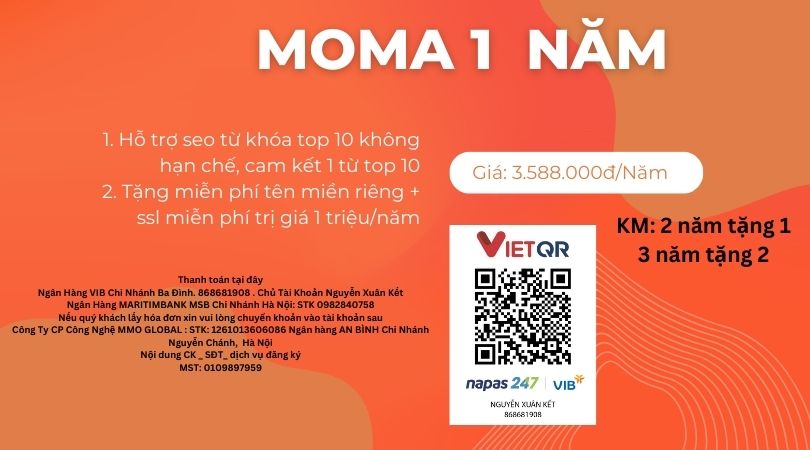 Nếu muốn được tặng tên miền riêng + seo top 10 google thì có thể dùng moma 1 năm: Chi phí 199.000/tháng một năm 2.4 triệu 3 năm là 4.8 triệu và 5 năm là 7.2 triệu