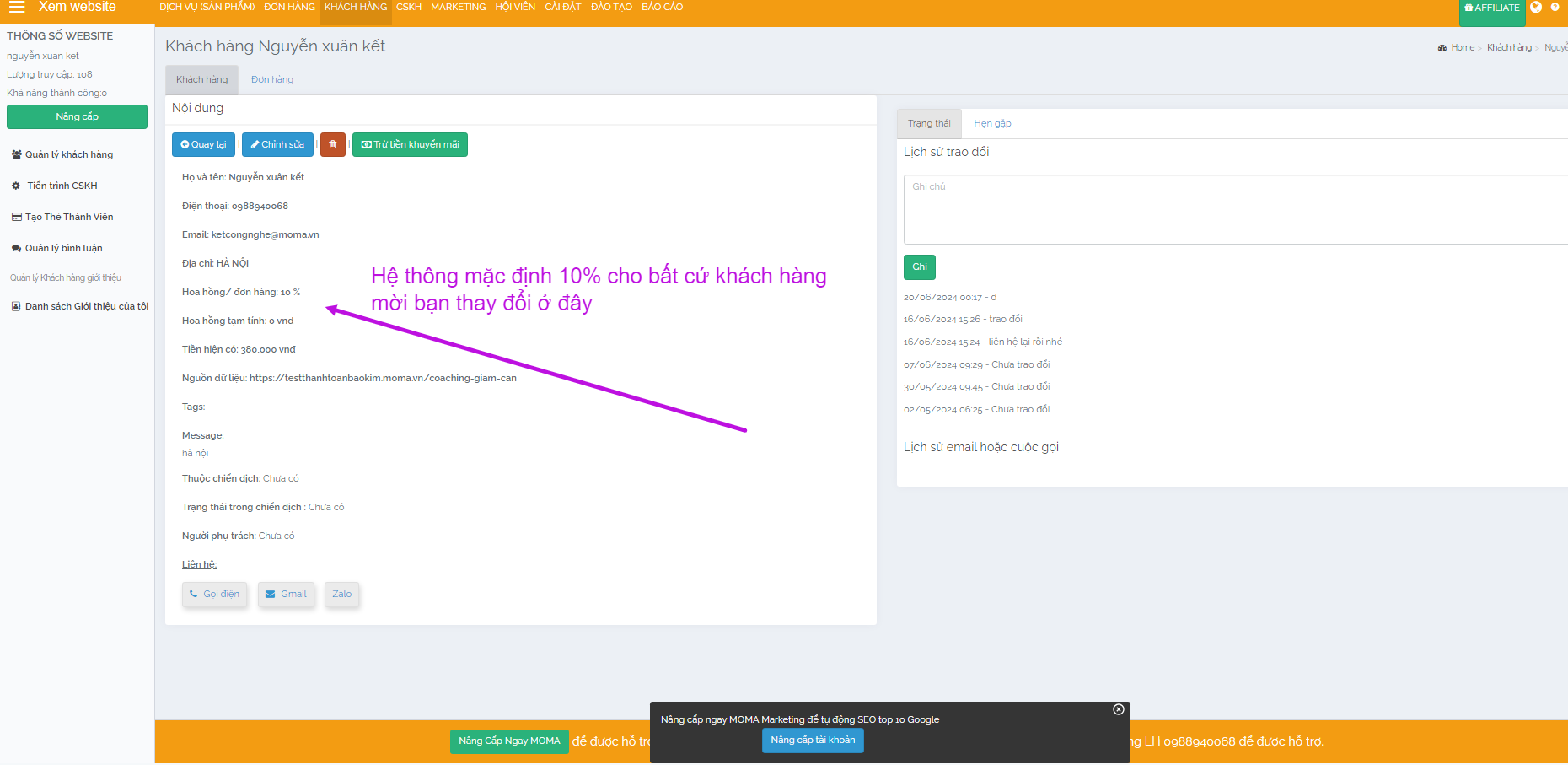 Một bạn sẽ được setup % bán hàng cho khách hàng % hoa hồng thủ công