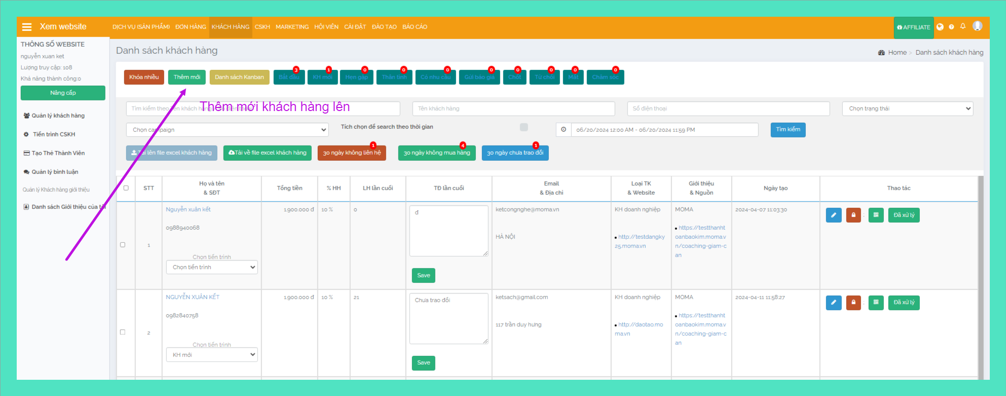 Cách 3: Nhân viên chăm sóc khách hàng nhập khách hàng lên khi khai thác kênh khác