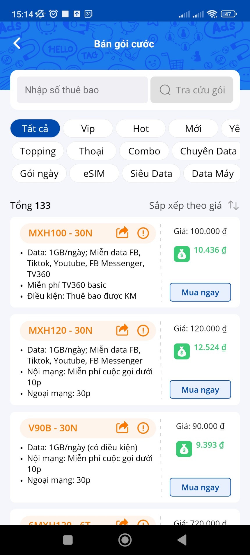 - Các gói phổ biển là gói mình hay mua hoặc khách hàng chung nhà mạng hay mua