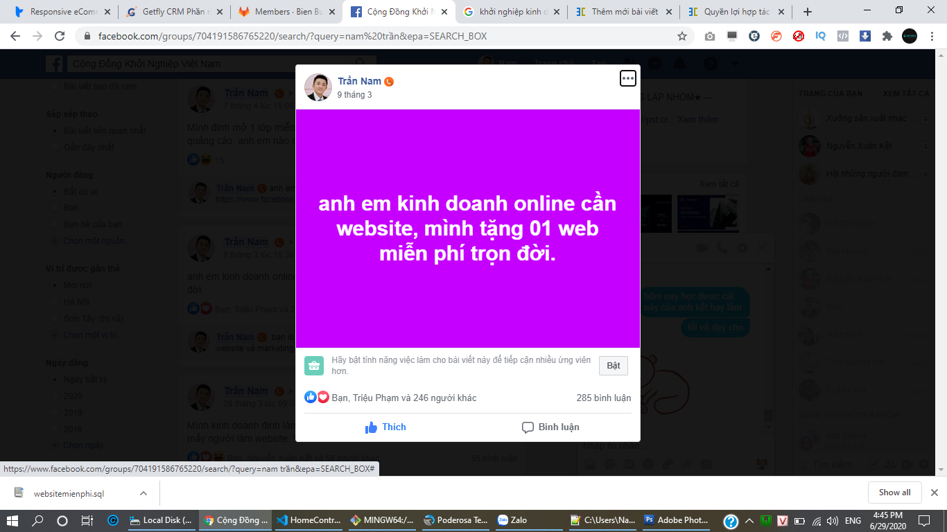 Ví dụ: Tôi bán thêm nền tảng website moma. Tôi chỉ cần đăng group là: "anh em kinh doanh cần website, tôi tặng 01 website miễn phí." Và tôi thu được hơn 300 người tạo website trên moma. Và có đến 50 người nâng cấp. Thế là tôi có mức thu nhập 5 triệu chỉ trong vòng chưa đầy 1 tuần.